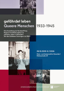zur Eröffnung unserer neuen Sonderausstellung, der Wanderausstellung „gefährdet leben. Queere Menschen 1933-1945″, die wir von der Bundesstiftung Magnus Hirschfeld ausgeliehen haben, laden wir Sie herzlich ein.